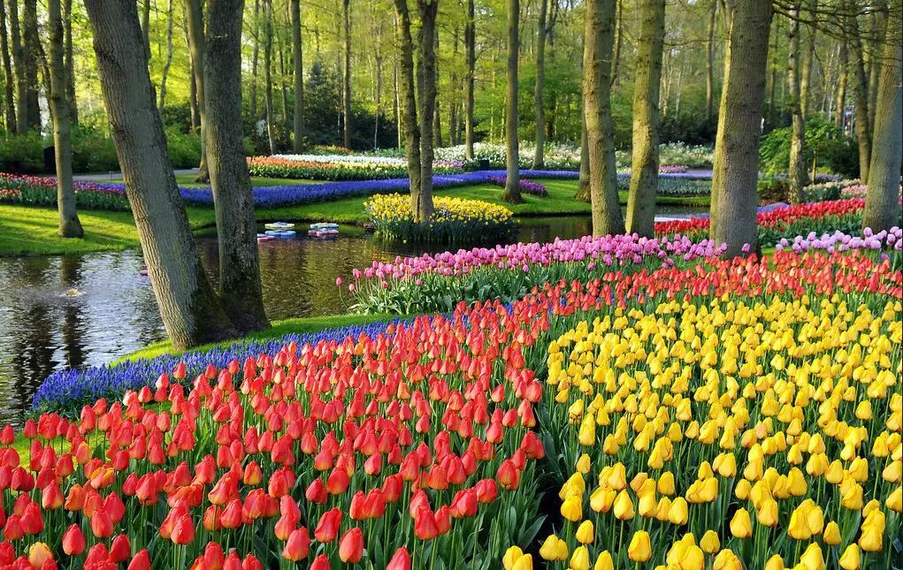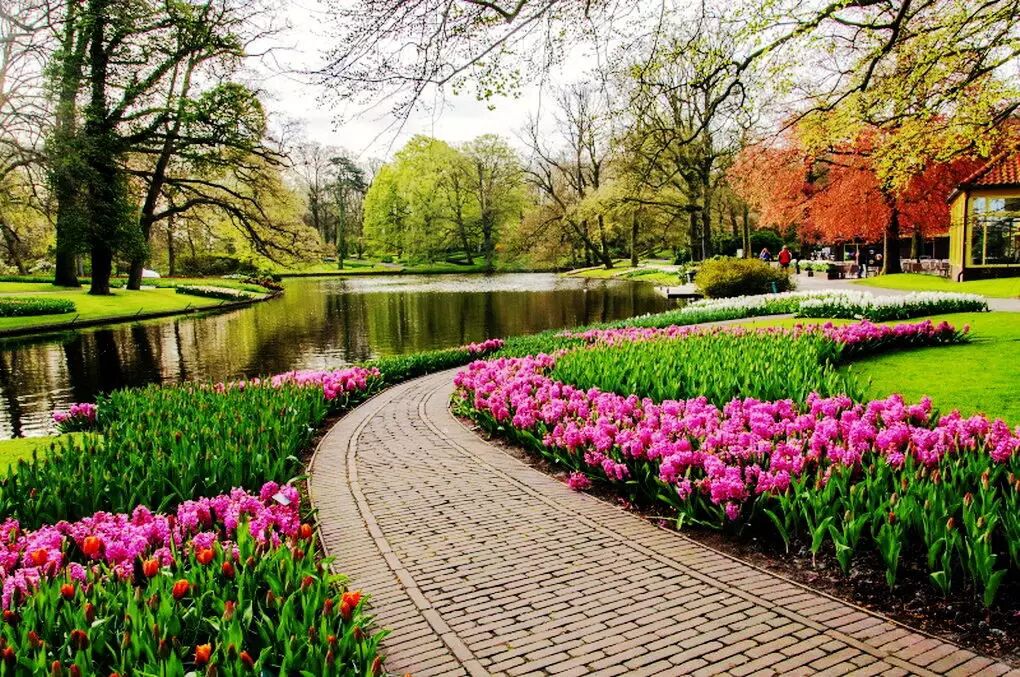 庫肯霍夫公園內鬱金香的品種、數量、質量以及布置手法堪稱世界之最。公園的周圍是成片的花田,園內由鬱金香、水仙花、風信子,以及各類的球莖花構成一幅色彩繁茂的畫卷。園中各類花卉達600萬株以上,還有很多難得一見的珍稀品種。每年的春天,這裡都將舉行為期八周左右的花展,同時還安排許多相關的活動,包括園藝與插花等的工作坊、各種主題的展覽等等。