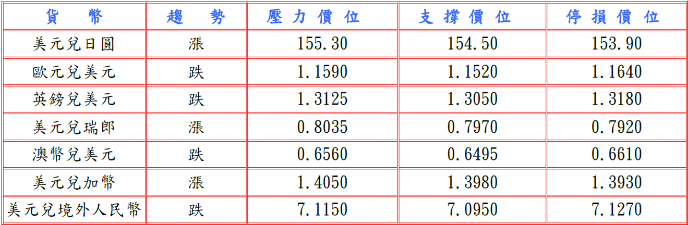 隨著前日BOJ副總裁若田部昌澄和第一生命經濟研究所首席經濟學家永濱利廣日本政府最高經濟小組新成員相繼呼籲採取比去年規模更大的經濟刺激計畫,突顯新政府在財政政策上更強烈的再通貨膨脹主義傾向,加重日圓賣壓;此外,路透調查顯示,80%經濟學家認為美國聯邦準備理事會(FED)將在下月再下調利率25個基點,而且FED理事米蘭再呼籲放鬆貨幣政策限制,但亞特蘭大聯邦儲備銀行總裁博斯蒂克意外宣布將於明年2月28日任期結束時退休,在臨別前仍堅持其鷹派立場,傾向維持利率不變,推升美元兌日圓至155.04高點。預估今日美元兌日圓支撐於154.30-50,阻力於155.30-50。