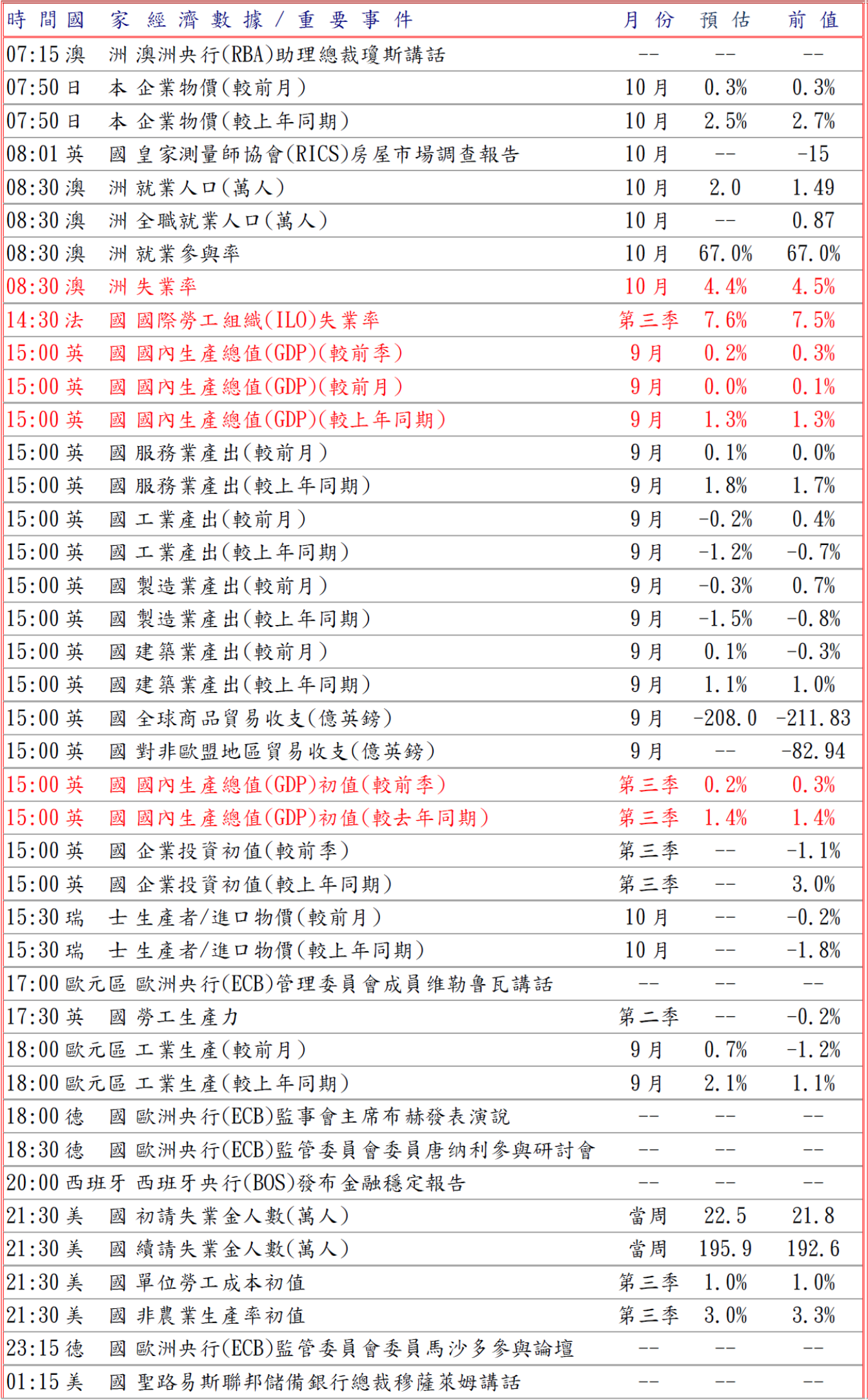 週三據路透短觀11月調查,日本非製造業景氣判斷指數持穩於正27,並受日圓走軟及訂單穩健提振,製造業景氣判斷指數攀升至2022年1月以來最高正17,而且日本財務大臣片山皋月不否認日圓疲軟對經濟的負面影響已明顯大於正面,並看到外匯市場出現快速單邊走勢,強調政府對過度無序波動保持警惕,但首相高市早苗強烈希望日本央行(BOJ)實施貨幣政策,在工資增長推動下穩定實現2%通貨膨脹目標,而且路透看到日本首相高市早苗的經濟刺激計畫草案未提及支出規模,但主張在危機管理和增長領域進行大膽且具戰略性投資,顯示該方案可能包含大規模支出,市場對日本財政的擔憂及對美國政府即將結束停擺的樂觀情緒,提振風險偏好,令日圓承壓,推動美元兌日圓自154.03低點上漲。