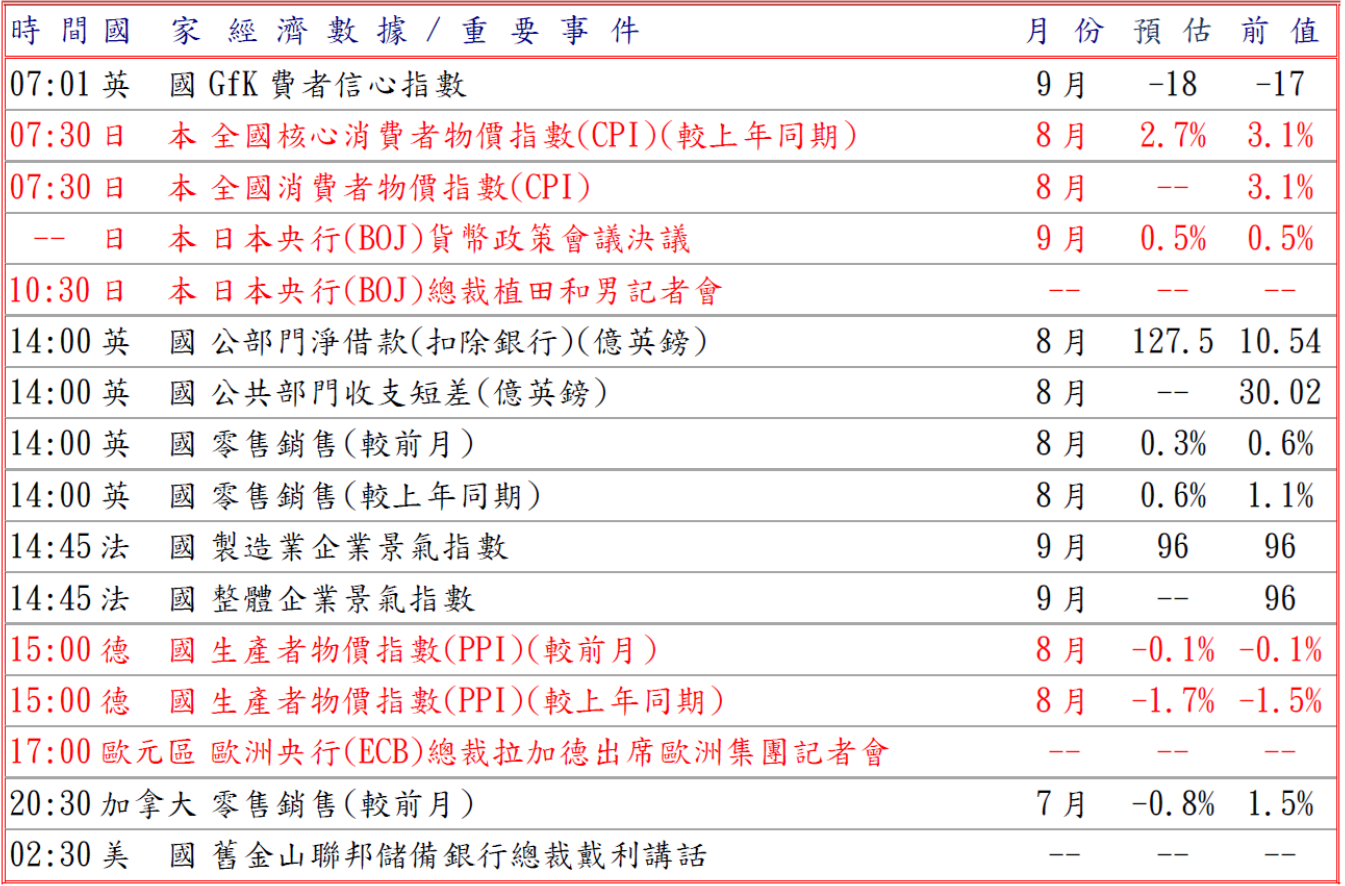 美國聯邦準備理事會(FED)如預期降息25個基點,並暗示今年餘下時間穩步降低借貸成本,但主席鮑威爾定調本次降息是風險管理,強調沒必要快速調整利率,提供美元支撐;此外,日本週四公布7月核心機械訂單較前月減4.6%超過預期及較上年同期增加4.9%不及預估值,並據日本資深議員、主張激進寬鬆貨幣政策的高市早苗宣布參加10月4日舉行的自民黨黨魁競選,前日本央行(BOJ)官員下田知行卻表示加息大環境已到位,即使高市早苗贏得執政黨黨魁選舉成為下任首相, BOJ仍可能在10月升息,而且市場訂價顯示BOJ在3月底前加息25個基點及今年內採取行動的可能性約50%,但BOJ週五結束為期兩天的政策會議,普遍預期維持利率0.5%不變,令日圓受阻,美元兌日圓持穩於146.75低點。