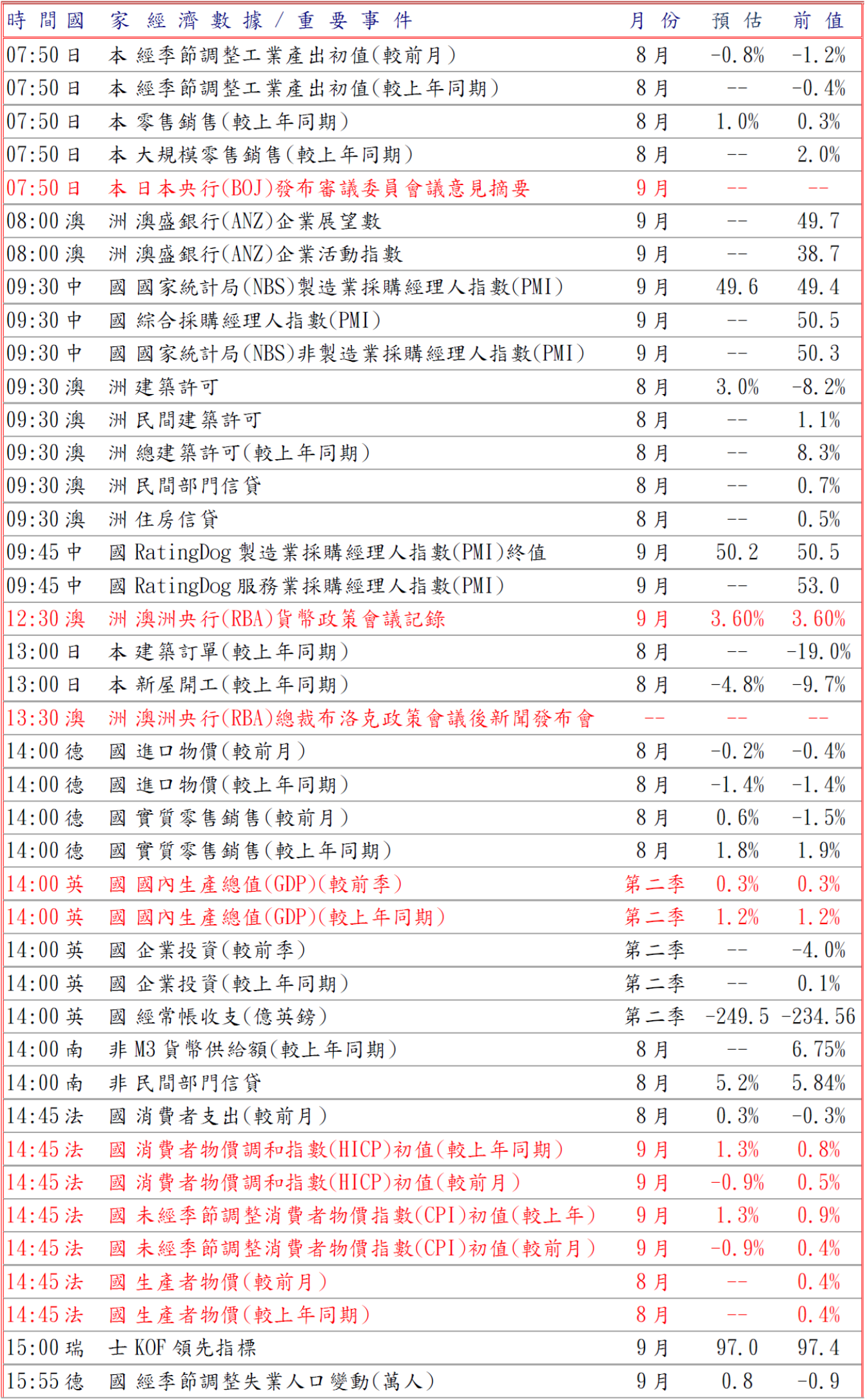 上週五發布的8月數據顯示,占美國經濟活動三分之二以上的消費者支出增長0.6%高於預期,個人消費支出(PCE)物價指數則較前月漲0.3%及較上年同期升2.7%達2月以來最大漲幅,核心PCE物價指數亦分別較前月漲0.2%及較上年同期升2.9%,數據彰顯經濟具韌性,而且里奇蒙聯邦儲備銀行總裁巴爾金表示,通貨膨脹和就業風險可能均有限,政策重點是平衡,可能讓美國聯邦準備理事會(FED)降息的努力複雜化,但FED監管副主席鮑曼呼籲果斷降息以抵禦就業市場日益嚴重的問題,週一令美元受阻,並據日本央行(BOJ)審議委員野口旭稱,由於經濟和物價上行風險大於下行風險,BOJ比以往任何時候都更需要加息,而且日本內閣府發布月度報告表示,美國貿易政策可能給經濟前景帶來下行風險,但影響主要體顯現在汽車行業,日本經濟正在溫和復甦,4月至6月增長快於預期,連續第五個季度實現擴張,提供日圓支撐,推動美元兌日圓自149.51高點走低。
