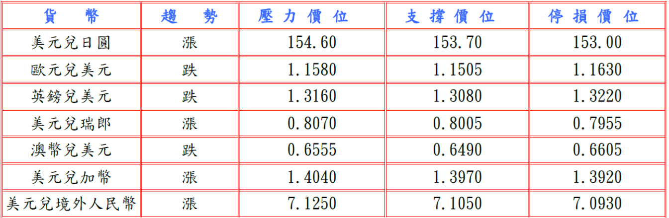 隨著美國總統川普與中國國家主席習近平會晤後,同意將對華關稅降至47%,以換取中國政府恢復購買美國大豆、保持稀土出口暢通及打擊芬太尼非法貿易,雙方還商量明年互訪的安排,均有利於維護雙方關係穩定,市場預計兩國的貿易關係進一步解凍,而且日本新任財務大臣片山皋月淡化過去對日圓強勢的言論,支持BOJ維持利率不變的決定,推升美元兌日圓至154.44高點。預估美元兌日圓支撐於153.50-70,阻力於154.60-80。