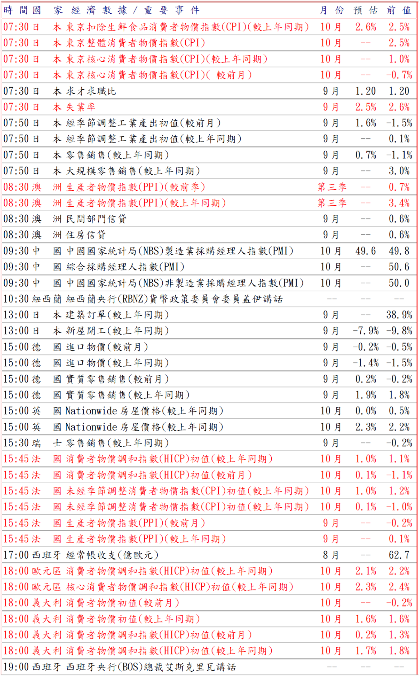 下周英國央行(BOE)會議召開前,市場消化近期一系列經濟數據,尤其通貨膨脹數據低於預期,提升BOE降息25個基點的機率達三分之一,相較FED暗示12月不再降息支撐美元,週四拖累英鎊兌美元自1.3218高點走低。隨著英國財政大臣里夫斯11月底的預算案將不得不採取增稅和減支措施規模的傳言和猜測不斷,恐導致BOE更快降息,擴大英鎊兌美元跌幅至1.3114低點。預估今日英鎊兌美元阻力於1.3160-80,支撐於1.3060-80。