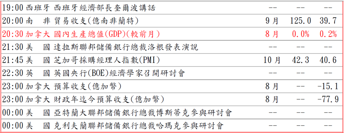 昨日澳盛銀行(ANZ)調查顯示,紐西蘭10月企業信心指數躍升至2月以來最高水平,同時利率掉期表明,澳洲央行(RBA)在11月4日的會議上下調其隔夜拆款利率25個基點的可能性僅為5%,而且美國與中國領導人會談取得成果的樂觀情緒,推動澳幣和紐元等風險貨幣走高;此外,德國與歐元區10月失業率均持平6.3%及第三季國內生產總值(GDP)分別較去年同期成長0.3%及1.3%優於預期,帶動歐元兌美元觸及1.1637高點。