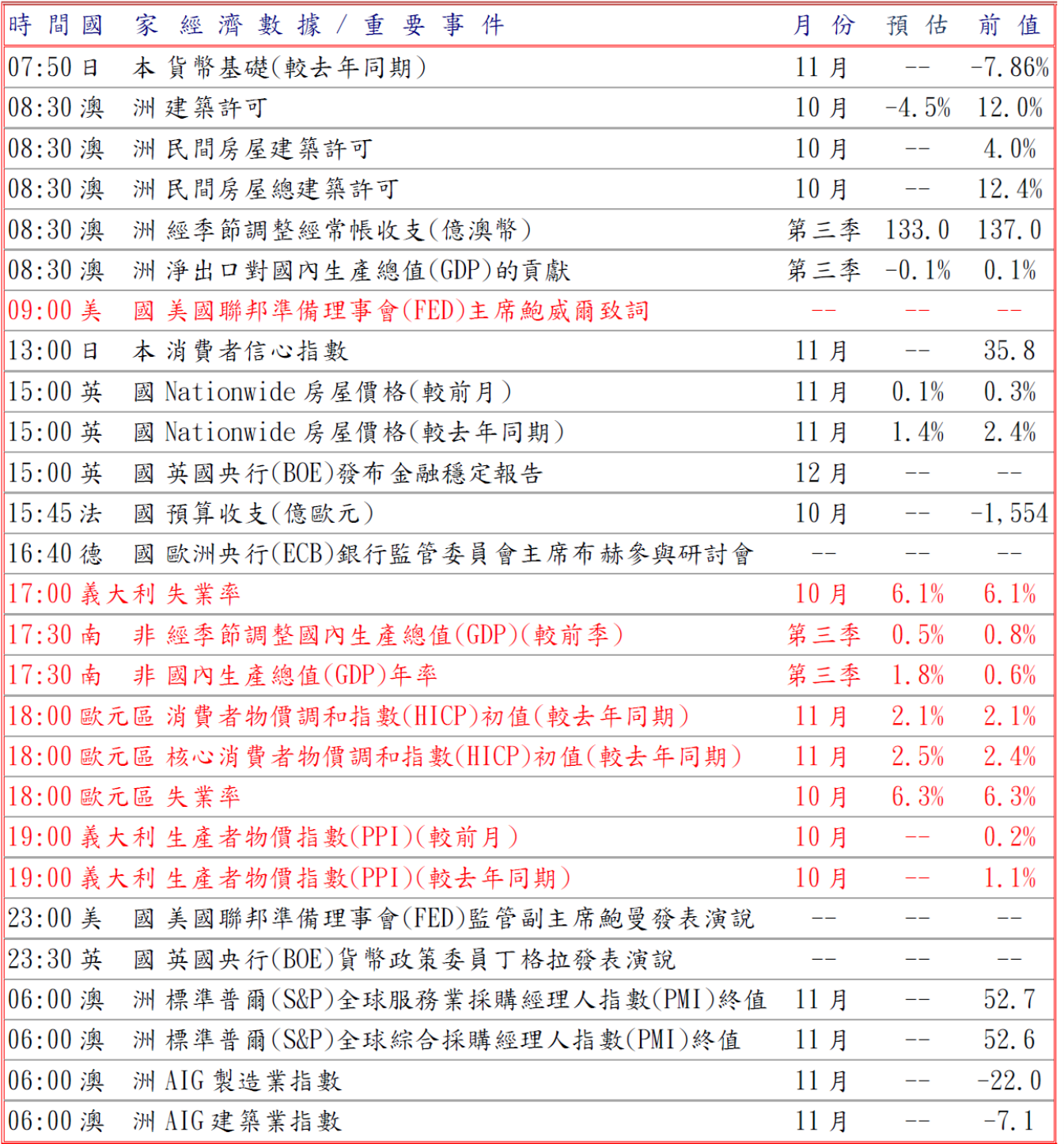 昨日房地產諮詢公司Cotality表示,澳洲11月房屋價格較前月漲1.0%,但澳洲第三季企業庫存減少0.9%及獲利零成長,並據紐西蘭央行(RBNZ)新任總裁布雷曼承諾繼續高度集中在通貨膨脹問題上,但RatingDog調查中國11月製造業PMI跌破50.0榮枯線,創四個月新低達49.9,削弱澳幣和紐元等風險貨幣,歐元兌美元則下滑至1.1588低點。