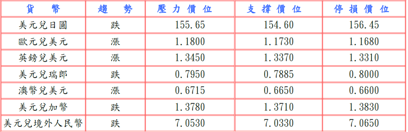據三位熟悉BOJ想法的消息人士稱,BOJ認為緊急干預以抑制債券收益率上升的必要性有限,違背其縮減刺激措施的努力,而且美國上周初請失業金人數激增至23.6萬人,增幅創近四年半最大,衝擊美元兌日圓跌至154.93低點,但美國9月數據顯示,因商品出口激增,貿易逆差縮窄至逾五年最低528億美元,而且躉售銷售較前月減0.2%,但耐用製成品庫存增加推動躉售庫存較前月勁升0.5%,可能提振第三季國內生產總值(GDP),扶助美元兌日圓拉回部分跌幅。預估今日美元兌日圓阻力於155.65-85,支撐於154.40-60。