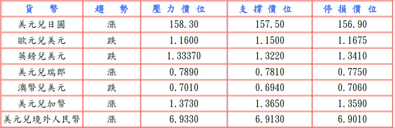 據三位熟悉日本央行(BOJ)決策思路的消息人士透露,中東衝突擴大增加BOJ於3月不加息的可能性,而且油價飆升使高度依賴進口燃料的日本經濟蒙上陰影,令日圓承壓;此外,紐約聯邦儲備銀行總裁威廉姆斯認為判斷伊朗戰爭的影響為時過早,若通貨膨脹緩解,FED仍可降息,而且明尼亞波利斯聯邦儲備銀行總裁卡什卡利表示伊朗衝突加劇貨幣政策前景不確定,但堪薩斯城聯邦儲備銀行總裁施密德強調不能對通貨膨脹過熱掉以輕心,而且國際貨幣基金組織(IMF)稱美國對外經濟狀況略惡化,但美元仍是全球經濟核心,提振美元兌日圓至157.96高點。預估今日美元兌日圓支撐於157.30-50,阻力於158.30-50。