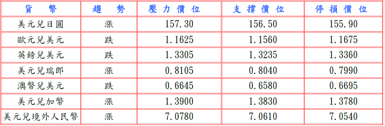 隨後世界大型企業研究會公布美國9月領先指標下降0.3%符合預期,但獨立工商業聯盟(NFIB)美國11月小企業樂觀指數升至99.0,並據美國勞工統計局發布職位空缺和勞動力流動調查(JOLTS)報告顯示,截至10月底,職位空缺增加1.2萬至767萬個,而且週三美國聯邦公開市場委員會(FOMC)的利率決議及FED主席會後聲明前的空頭回補,推升美元兌日圓至156.95高點。預估今日美元兌日圓支撐於156.30-50,阻力於157.30-50。