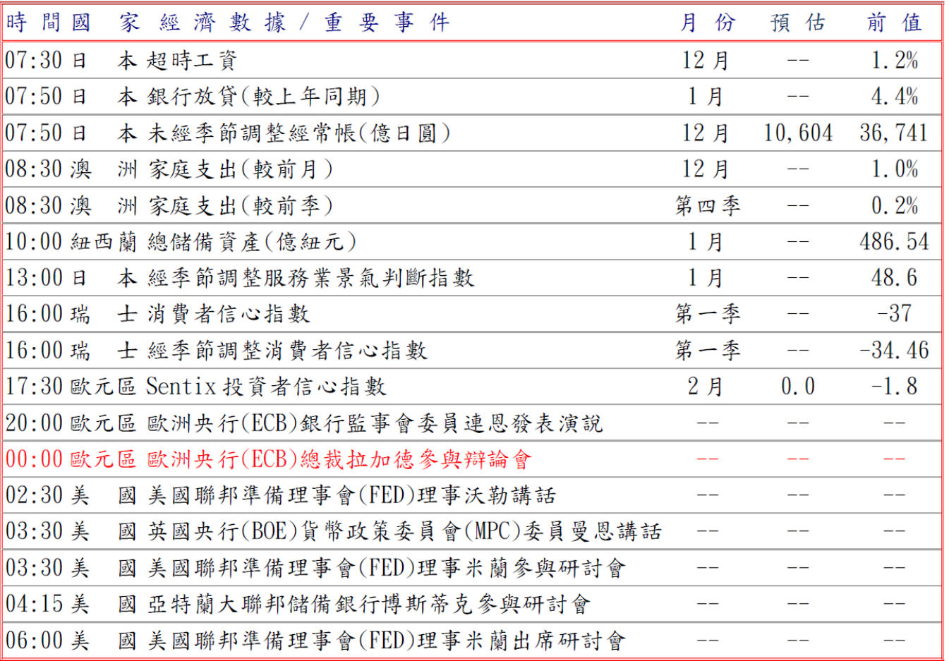 上周美國就業數據接連疲弱,但避險情緒支撐美元;此外,上週五日本政府公布1月末外匯儲備增至13,948.0億美元及12月家庭支出較去年同期降2.6%符合預期,但12月經季節調整家庭支出較前月跌2.9%超過預估值,並據日本央行(BOJ)審議委員增一行表示,日本企業及家庭正擺脫根深蒂固的通貨緊縮行為,BOJ必須及時加息以防止基礎通貨膨脹率超過2%目標,而且日本前高級外匯官員中尾武彥稱,動用外匯儲備進行匯率干預應以加息為後盾,但多項民意調查顯示,日本首相高市早苗領導的自民黨及其聯合執政夥伴日本維新會可望在眾議院選舉取得壓倒性勝利,將減輕其財政政策目標面臨的短期制約,可是政府債務激增的擔憂壓制日本公債和日圓,推動美元兌日圓自156.50低點上漲。