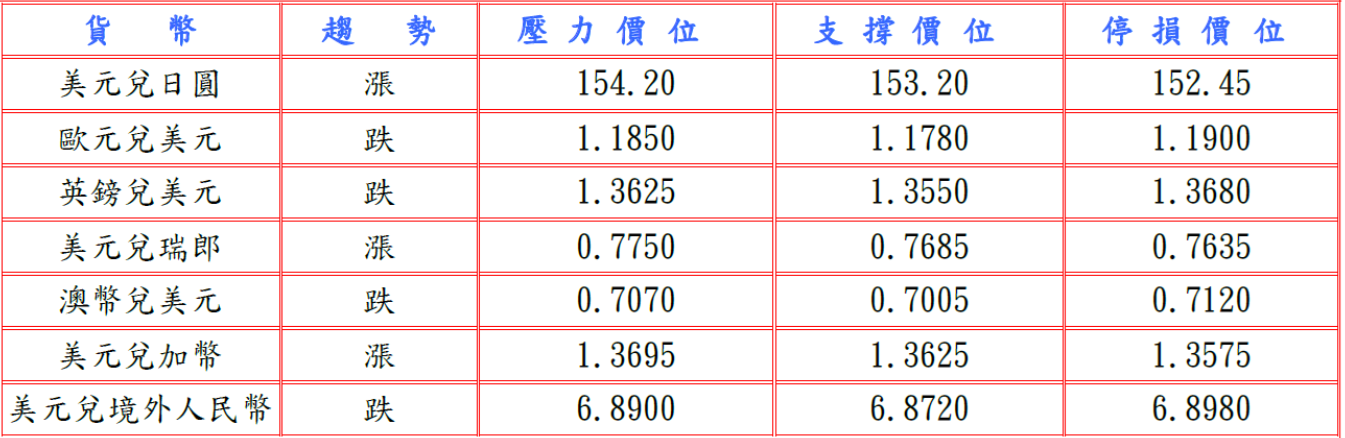 隨後日本12月經季節調整數據顯示,工業產出修正為較前月降0.1%與初值相符及設備使用率較前月增加1.3%較上月佳,但日本BOJ總裁植田和男與首相高市早苗舉行自民黨在大選中獲得壓倒性勝利後首次雙邊會談,會後植田和男稱雙方就經濟與金融形勢進行廣泛意見交換,並表示首相未對貨幣政策提出任何具體要求,亦拒絕就首相是否同意加息計畫發表評論,但高市早苗擁有今年填補BOJ九人貨幣政策委員會兩個空缺任命權,可能影響BOJ政策辯論走向,加重日圓賣壓,而且本周美國將陸續公布核心個人消費支出(PCE)物價、第四季GDP初值及密西根大學消費者信心指數終值等多項數據,引發空頭回補,推升美元兌日圓至153.63高點。預估今日美元兌日圓支撐於153.00-20,阻力於154.20-40。